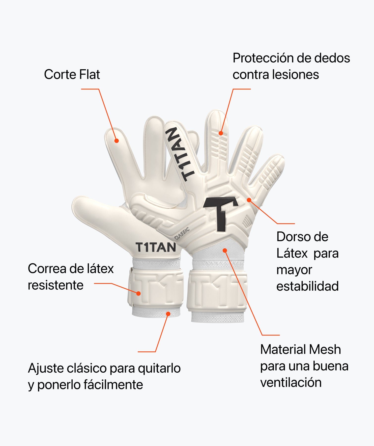Inspirados en nuestros mejores modelos profesionales: Los CLASSIC 1.0 WHITE-OUT te ofrecen un fuerte agarre y una buena resistencia a la abrasión. Esto los convierte en los guantes T1TAN perfectos para principiantes ambiciosos y porteros jóvenes exigentes.